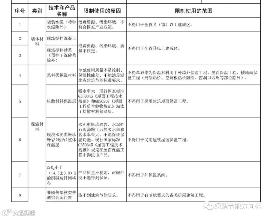 下面是限制使用技术目录,大家可以看到,那些浆料类的保温技术,例如聚苯颗粒保温砂浆,无机保温砂浆等都属于限制类使用技术,不能单独作为建筑保温材料。
