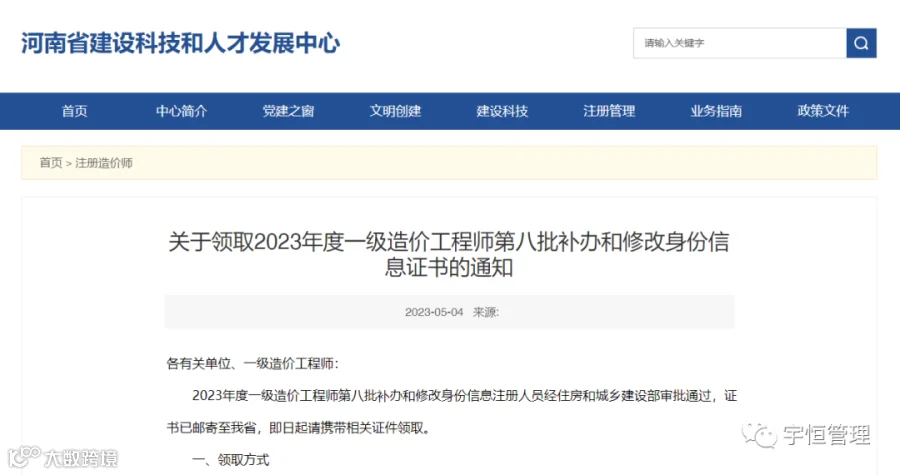 2023年度一级造价工程师第八批补办和修改身份信息注册人员经住房和城乡建设部审批通过,证书已邮寄至我省,即日起请携带相关证件领取。