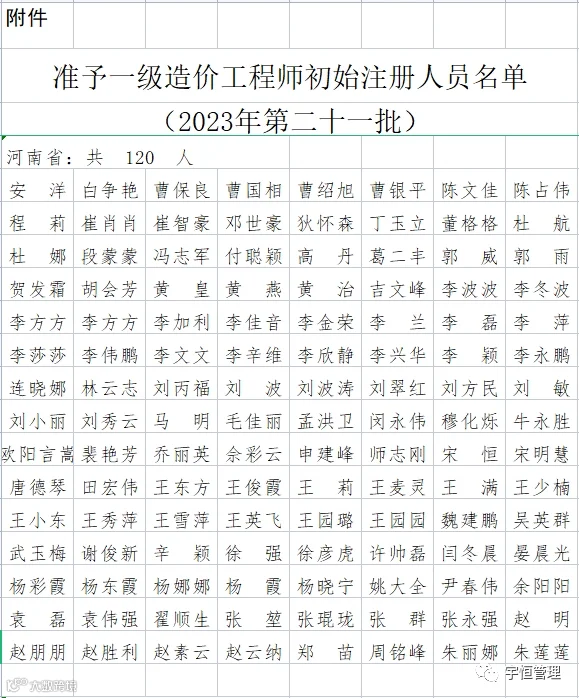 附件:准予一级造价工程师初始注册人员名单(2023年第二十一批)