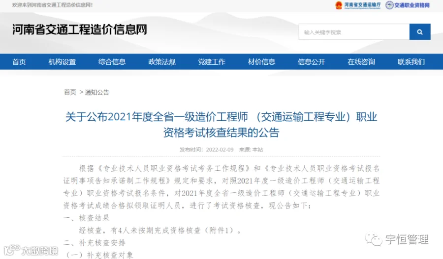 关于公布2021年度全省一级造价工程师 (交通运输工程专业)职业资格考试核查结果的公告