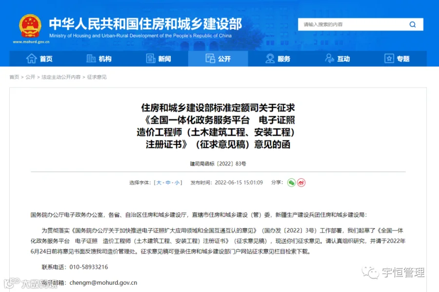 为贯彻落实《国务院办公厅关于加快推进电子证照扩大应用领域和全国互通互认的意见》(国办发〔2022〕3号)工作部署,我们起草了《全国一体化政务服务平台 电子证照 造价工程师(土木建筑工程、安装工程)注册证书》(征求意见稿),现送你们征求意见。请认真组织研究,并请于2022年6月24日前将意见书面反馈我司造价管理处。征求意见稿可登录住房和城乡建设部门户网站征求意见栏目检索下载。