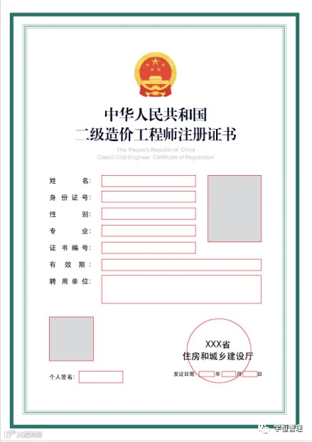 二级造价工程师(土木建筑工程、安装工程)注册证书样式