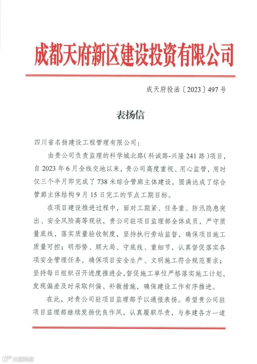 国庆中秋双节到来之际,由名扬负责监理的科学城北路(科诚路-兴隆241路)项目受到业主天投集团通报表扬。该项目自2023年6月全线交地以来,名扬高度重视、用心监管,仅三个半月即完成了738米综合管廊主体建设,圆满达成了综合管廊主体结构9月15日完工的节点工期目标。