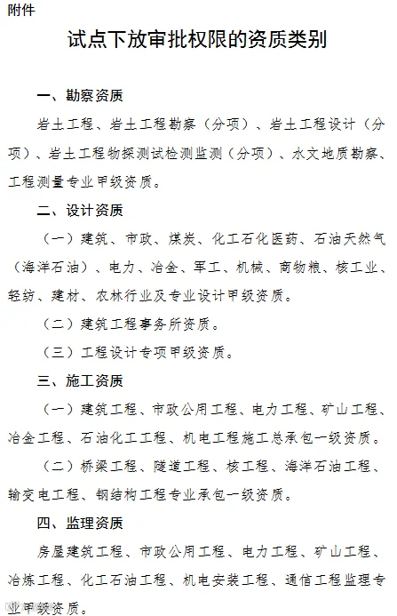 除最高等级资质(综合资质、特级资质)和需跨部门审批的资质外,将原由我部负责审批的其他资质审批权限(包括重组、合并、分立,详见附件)下放至试点地区省级住房和城乡建设主管部门。新资质标准出台前,按现行资质标准进行审批,审批方式由试点地区自行确定。