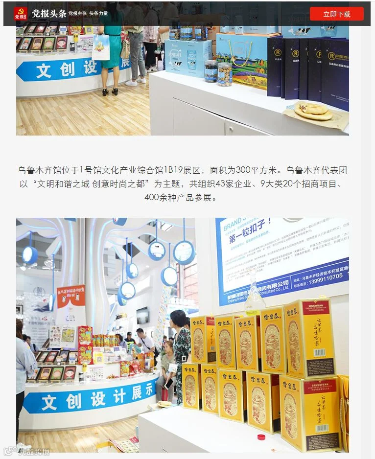 乌鲁木齐馆位于1号馆文化产业综合馆1B19展区,面积300平方米,展馆分为七个版块,通过一件件文化特色展品讲述乌鲁木齐文明、和谐、创意、时尚的故事。爵封哈密瓜酒作为新疆特色品牌好礼亮相了此次文博会。