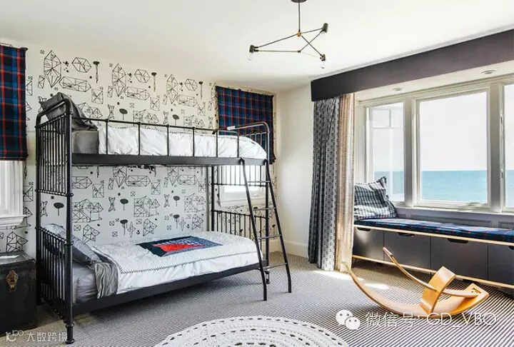 ▲就连孩子们的卧室和玩耍的区域也非常具有个性,在墙纸上选择独特的黑白格子以及带有各种符号图案。上下铺也是活泼好动的孩子们的爱,一旁的窗户不仅可以带来充足的光线,放眼望去也是一片美景。