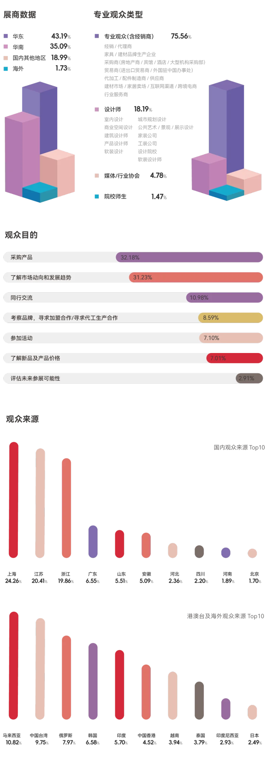 经过8年多的发展,中国家博会(上海)坚持以品质内销市场为主导,内外销双轮驱动,展店联动融合赋能,顶尖设计品牌与行业头部品牌交相辉映。中国家博会(上海)展出题材全面,覆盖家居上下游全产业链,以设计家居为核心,涵盖睡眠家具、沙发及两厅家具、办公商用与酒店家具、家具生产设备、饰品家纺、户外家居等全题材产品。中国家博会(上海)作为全球领先的专业型家居展览会,同期举办CIFF WMF国际木工展、CIFF上海商办空间展、CIFF上海潮向生活美学展、CIFF上海都市户外展,致力于实现365天全渠道营销,构筑互利共赢的多元化家居生态圈。