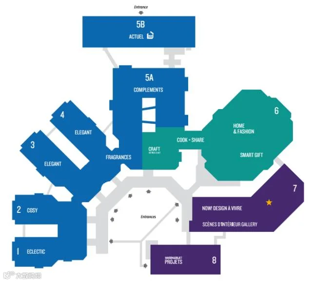 M&O巴黎展,共分为三大主题,分别是家(HALLS 1-2-3-4-5A-5B)、精品(HALLS 5A-6)和趋势(HALLS 7-8),分别对应图中三种不同的颜色。