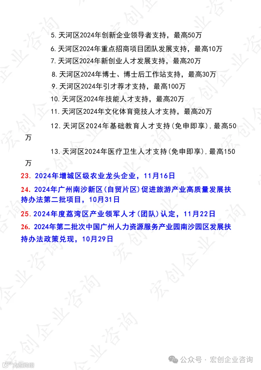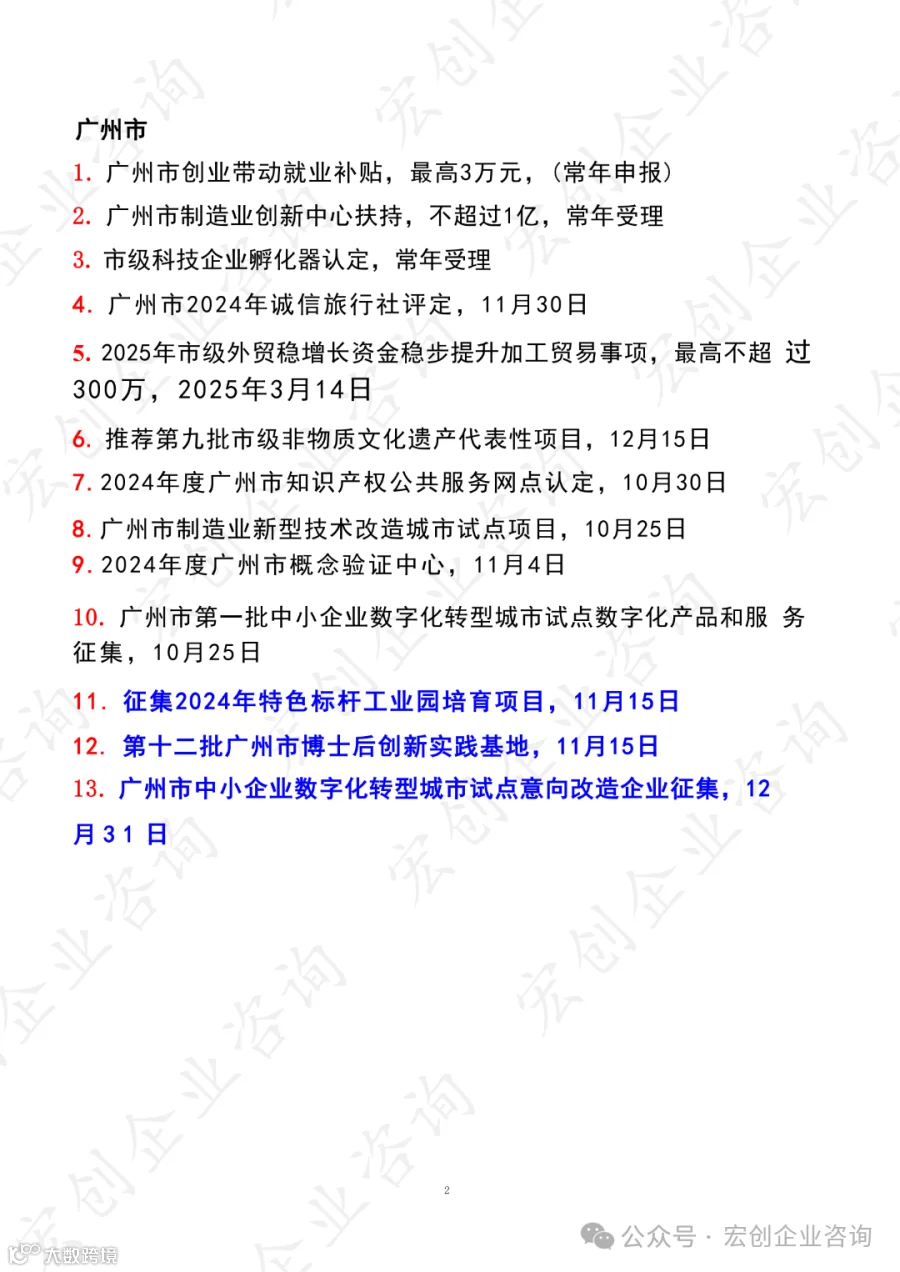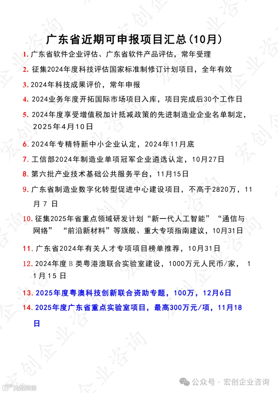 20241024期广东省近期可申报项目汇总(10月) 宏创企业咨询