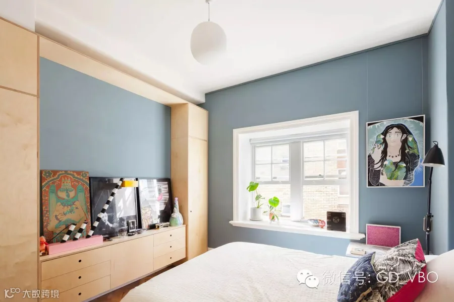 ▲卧室以纯净的淡蓝色作为空间基调,白色的床上用品,木质橱柜和各种具有个性的海报做点缀,多线形的图案与有趣元素相结合,营造出轻快的氛围。