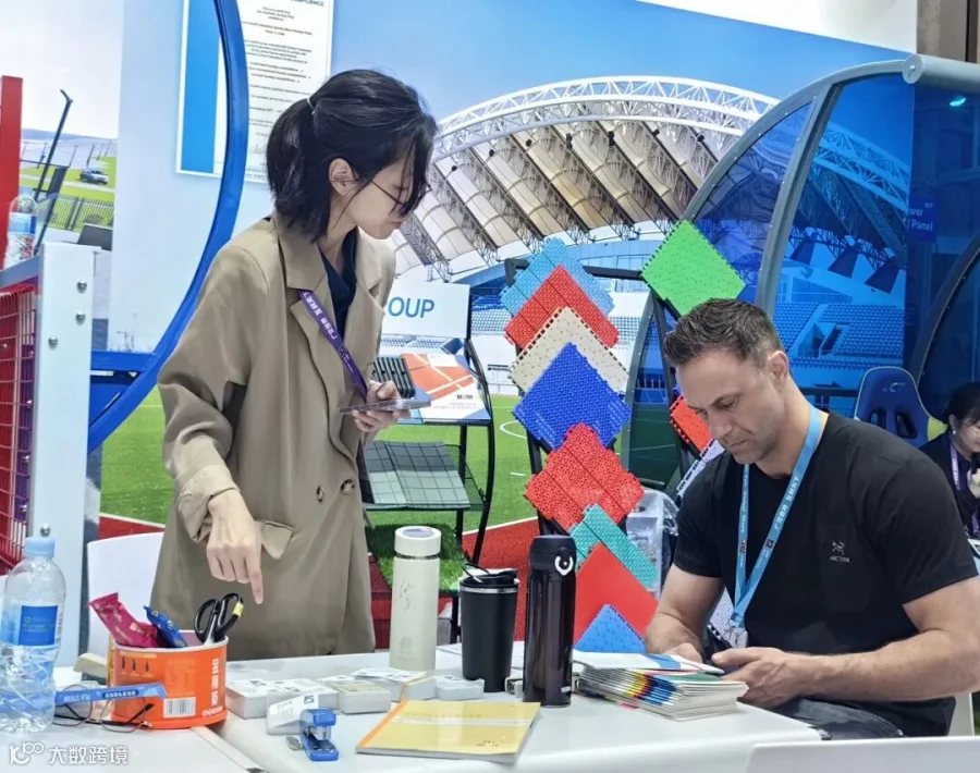 运动地面系统:陈列人造草皮、拼装地板,覆盖专业赛事至休闲运动场景,环保耐用材质与丰富配色,吸引多位海外客户现场测试。