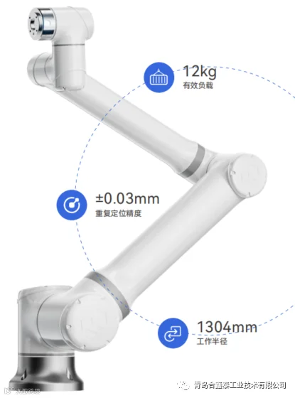 艾利特EC612协作机器人负载能力12kg,工作半径高达1304mm,重复定位精度±0.03mm,工具最大速度,关节可±360°旋转,支持多角度安装,体积小、重量轻,高负载自重比。