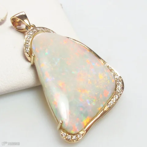 指胚体色调是白色或浅色调的欧泊。它产量比黑欧泊多很多,变彩也更强烈,因此具有很高的佩戴价值。白欧泊可以利用背封式包镶提升变彩,甚至可以成为高价的收藏级别欧泊。