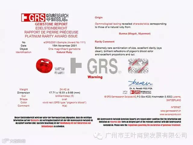 证书:除此之外,红宝石的产地也是很重要的,另外还需要一张权威的鉴定证书。
