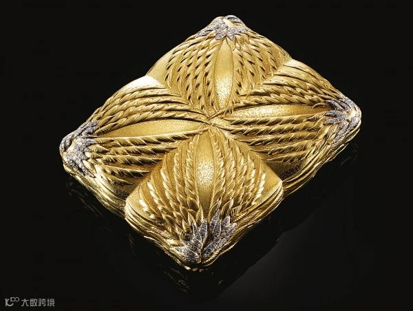 盒身就像一个靠垫抱枕,采用黄金镶嵌钻石打造,上面压印着金质曲线,仿佛抽象的翅膀,在画面中心形成一个圣安德鲁十字架。