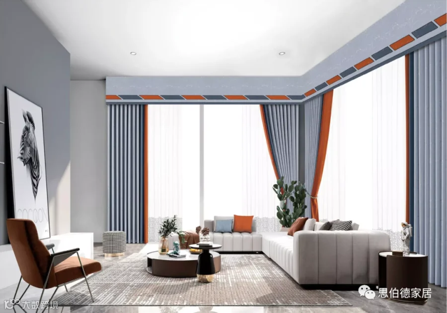 2、如果不想选择与墙面相近的颜色,那么可以选择一种和室内搭配有关联的颜色,比如选择与沙发、抱枕、地毯、挂饰等相近的颜色,这样窗帘的颜色就能和室内有呼应,不至于显得太突兀,灵活性也更强。