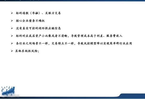2、那么在3.0的供应链金融模式有两类参与者,第一类,是以遇善房和熊猫车险为代表的SAAS、B TO B供应链金融企业,这类企业立足于一定的销售场景,并将交易数据准确获取,基于数据为企业开展融资服务。第二类,开发一批具有本身较好信用基础和供应链竞争实力的企业作为核心企业,为其上下游做金融服务。然后我们发现,两类参与者有一个共通点,在于这两类企业都可以把控整个交易场景的闭环,那么这两类企业可以基于平台交易数据作风控。第一类企业比起传统的控货、控信息流、控资金外,这类企业掌握了终端的成交情况。举例遇善房和熊猫车险,基于车险、房地产行业的特点,平台根据最终的C端用户交易凭证,例如:电子保单、房产网签单,在确认终端成交交易真实无误的情况下再回头对销售中介进行垫佣的金融业务,通过控制终端成交闭环保证链条上企业的还款质量,从而形成刚兑资产。第二类企业以产业链中的核心企业为标的,为其上下游做金融服务,举例中企云链,该企业中期盈利是由11家央企和2家银行、10家地方核心企业共同组建的供应链金融公司,平台上流转的是依托大企业在行业中的领军地位和优质信用,利用银行等金融机构给予大企业的授信和资金支持,创新出的一种可拆分可流转可融资的电子付款承诺函,并称其为云信,为企业间往来款清算提供新选择,通过“云信”实现大企业信用流转和中小企业快速融资,让传统金融无法涉足的产业链末梢企业也能享受到产业链中大企业的优质信用,充分发挥互联网金融带来的长尾效应,惠及产业链上下游的广大中小企业。然而其实就是一种实质上是债权债务的一个转让的一个合同,也就是N+N的模式,中间任何一个交易环节的债权人债务合同都可以被变成一个信用资产,用来作为支付手段,服务联盟链里任意两家企业日常的供应和采购支付的,相当于云信就是一个支付体系了,小系统里面它是可以按照货币流通的,其实在传统里有的,参考供应链1.0时期,所谓银行承兑汇票和商业承兑汇票就是此作用,但不同的是以往只有银行来做,或者具有相应资质的商业企业才能发,然而云信可以做到联盟链里面任意一家企业都可以发起,这就是区块链所谓的共识。云信还有另外一个亮点在于,如若联盟链内企业无法达成信任共识,链条内的参与者还有两家银行为联盟链内的企业做兜底,相比起传统银行承兑汇票和商业承兑汇票,更加电子化,便捷,并且为联盟链内的企业增添了信心。