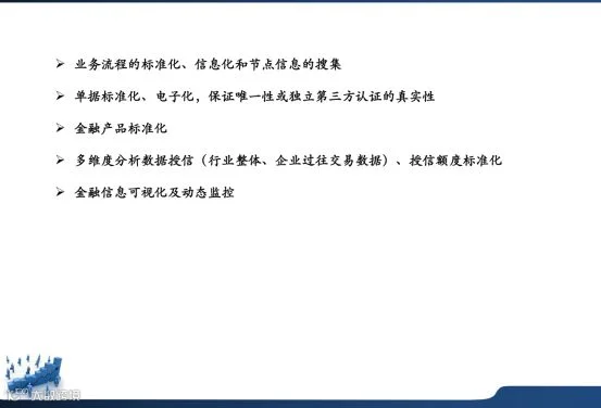 新型的供应链金融需要深入行业,深入场景,了解业务的主要流程和重要节点,将业务过程中的重要节点和交易内容信息化、系统化,产品化的工具或系统能够真实的获取企业的真实业务数据,提升风控的颗粒度和实施效率,减少人为干预因素。尤其是延伸到消费终端的服务,其信息的丰富度进一步提升,规模性造假的的难度更大。将参与方信息以及各个重要业务节点信息统一组织起来,形成一系列标准化的单据,基于该单据可以形成供应链金融的最底层资产,是一种相对标准化的、具有唯一性的、风控信息颗粒度高的、可穿透的底层资产。这些单据可以是涵盖业务信息的库存仓单,可以是包含交易信息和车辆合格证信息的卖车单据,可以是包含交易信息和保险保单信息的保险业务单据。 此外,近几年兴起的区块链技术在该领域的运用更是可以进一步提升整体整个业务系统的安全信和可信度,值得深入探索。