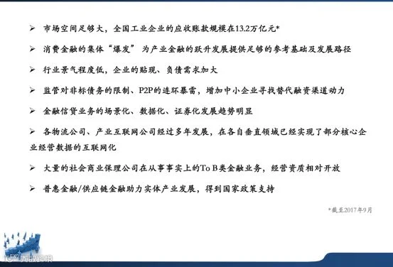 5、产业与金融机构的业务都在各自领域经历了在线化与互联网化,业务流程的线上化程度、行业数据的可获性程度以及行业B TO B的发展程度与以往有了很大提升,成了供应链金融业务开展的催化剂。此外,金融机构的资产证券化放开也进一步推动行业发展。