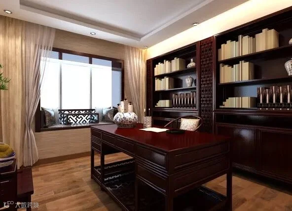 一个雅致中式书房的必备:地板、文房四宝、书桌、书柜、椅子、书案、塌、案桌等。