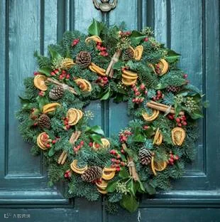 西方国家圣诞节其间挂在家门口用的装饰品,通常用绿色的枝叶或藤条(松毛、松针等)和银色的金属及金色的铃铛配以红色的缎带组成主色调绿、白、黄、红代表欢乐喜庆上面写着MERRY CHRISMAS或者简写为X'mas