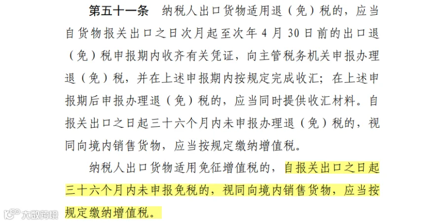 第五十一条 纳税人出口货物适用退(免)税的,应当自货物报关出口之日次月起至次年 4 月 30 日前的出口退(免)税申报期内收齐有关凭证,向主管税务机关申报办理退(免)税,并在上述申报期内按规定完成收汇;在上述申报期后申报办理退(免)税的,应当同时提供收汇材料。自报关出口之日起三十六个月内未申报办理退(免)税的,视同向境内销售货物,应当按规定缴纳增值税。纳税人出口货物适用免征增值税的,自报关出口之日起三十六个月内未申报免税的,视同向境内销售货物,应当按规定缴纳增值税。