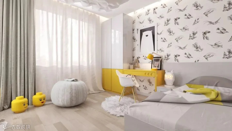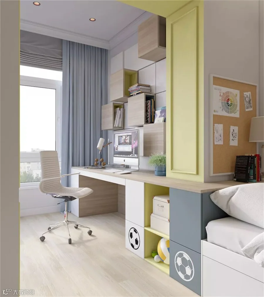 12岁以后,应该让孩子根据自己的兴趣爱好元素来布置空间,能让孩子更感受到尊重和自我空间的归属感。此阶段的孩子已经有自己的隐私需求,准备一个非开放性的柜子或者适当设置上锁的柜子是有必要的。