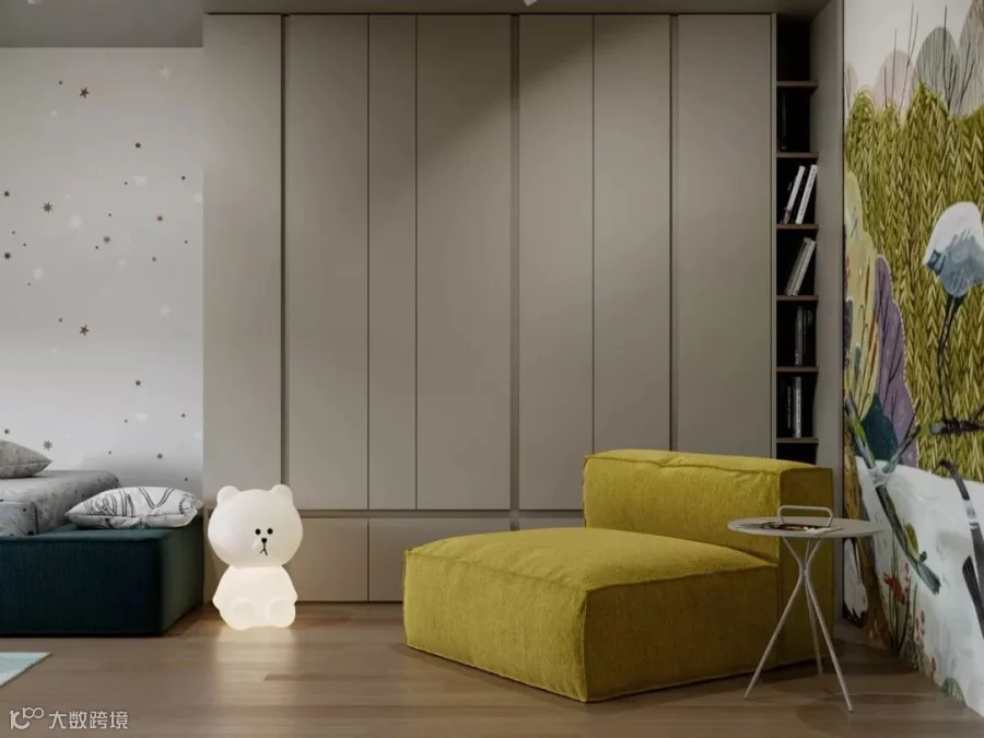 学龄前儿童,除了能跑能走,还能掌握读、写和简单动手能力。所以,空间尽可能搭配一些可写写画画和玩乐的设计。