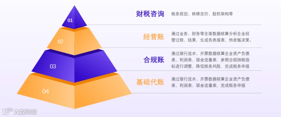 合规账是基础代账产品的升级版,相比基础代账事后做账而言,合规账将财税管理前置,事前对业务进行财税规划测算,事中完善业务合规证据链,事后合规申报。合规账重在应对税务风险。