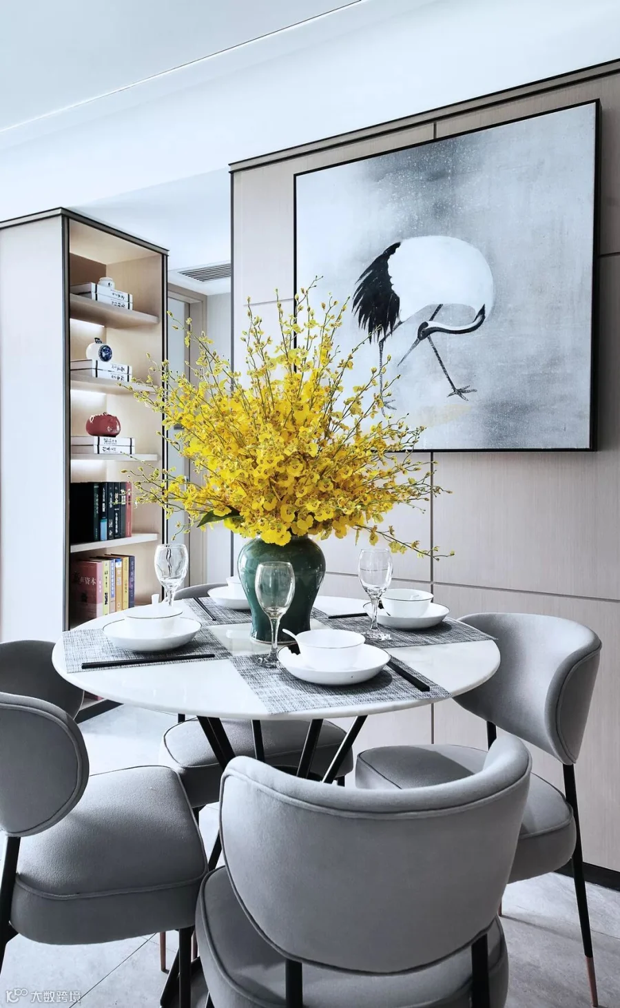 ▲餐厅背景的鹤舞图,对应客厅鹤舞背景,相当彰宜。餐桌的跳舞兰,以淡黄色为整个偏灰餐厅的跳色,视觉上增添更多一丝暖意