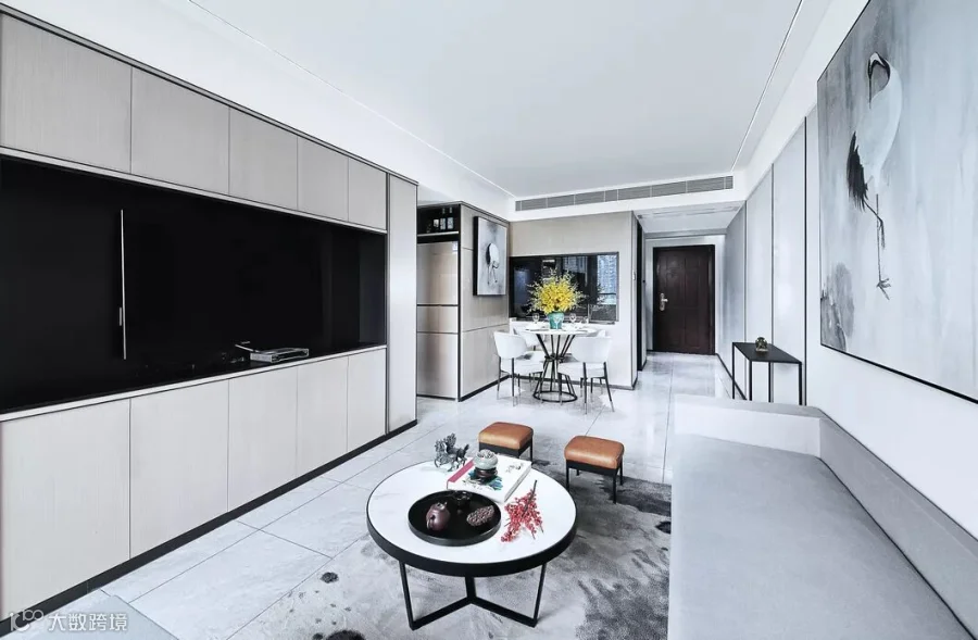 ▲客厅主打简约灰的色调,线条简洁的沙发对应直线造型的电视背景墙,以鹤舞挂画点缀沙发背景,彰显主人志高而不傲的心性