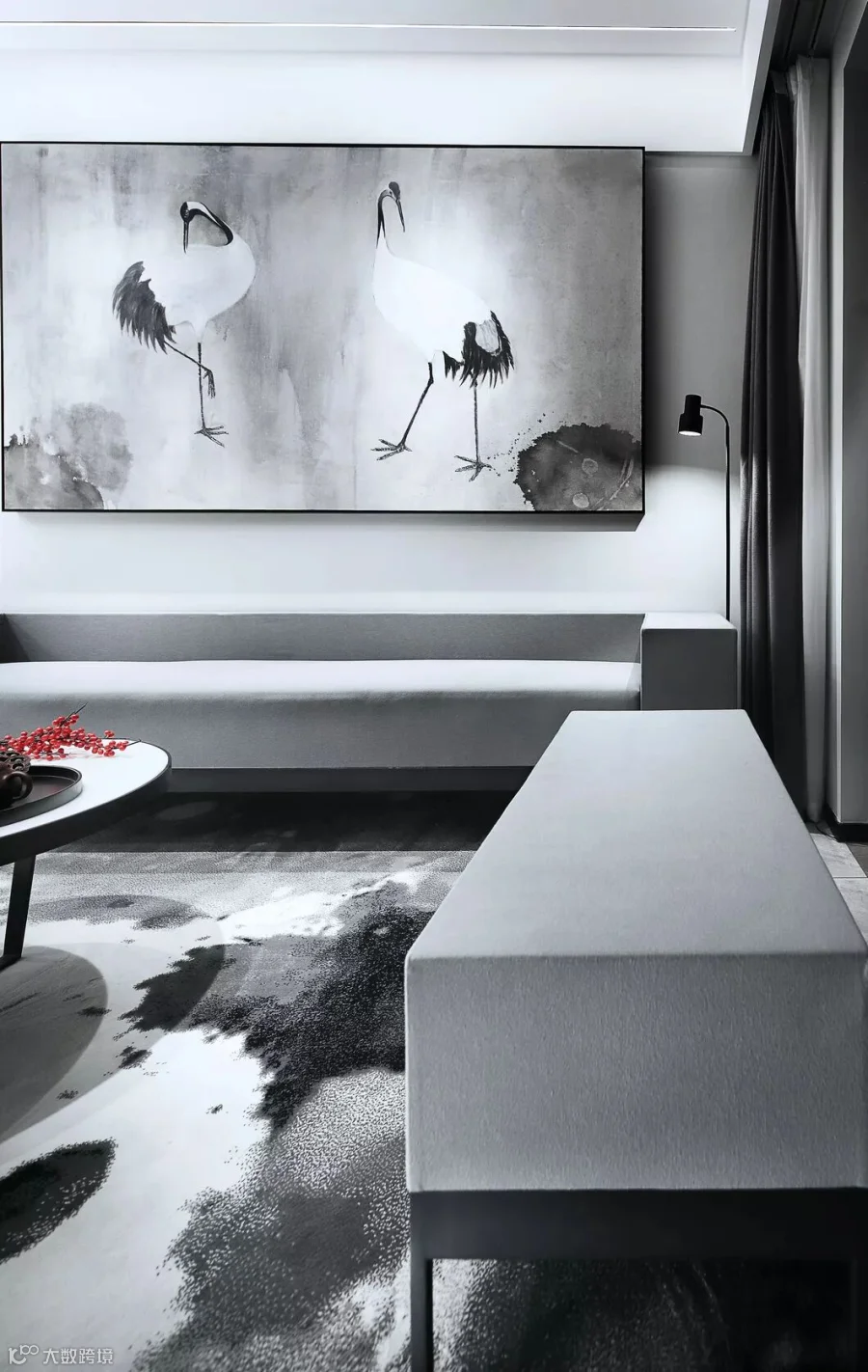 ▲中式泼墨羊毛地毯,增添了客厅的禅意格调;深咖色皮质的2张单人凳弥补了整屋灰色格调的稍显清冷,又能恰到好处的提升了实用性,补充了一字型沙发的座位不足。