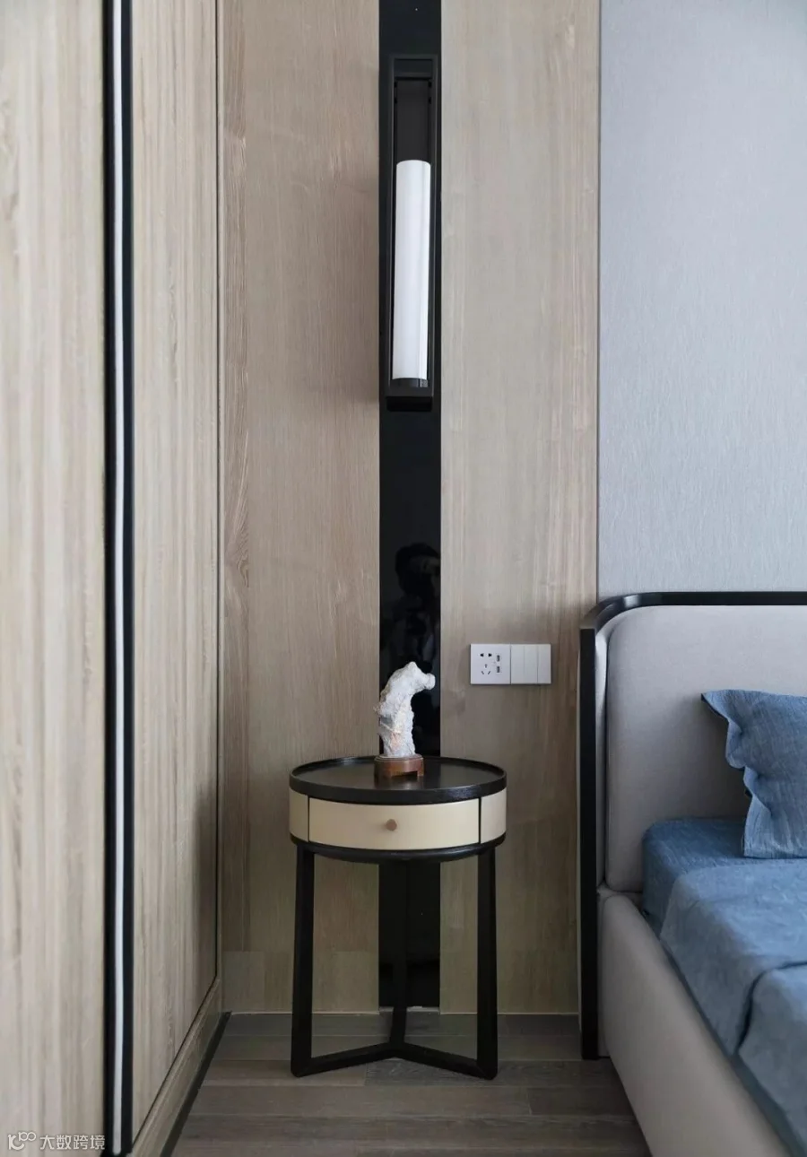 ▲ 主卧,木色地板搭配局部木饰面背景,加入浅灰色硬包嵌入黑色线条,卡其色大床与圆形床边桌用随意小件装饰