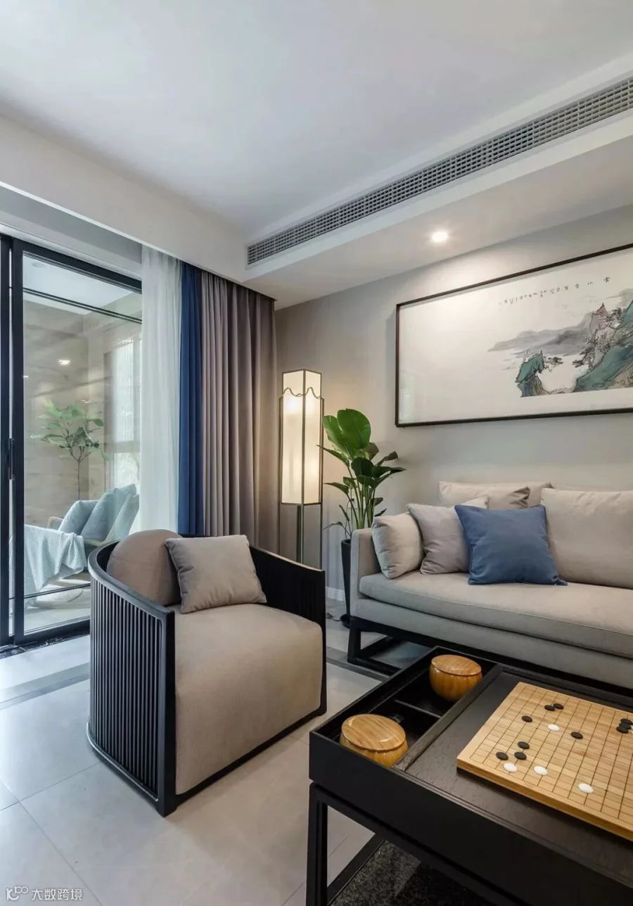 ▲ 客厅浅色瓷砖地面打一圈双色波导线,极简顶面装新中式吊灯