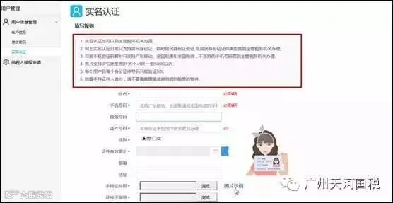 4.进入左侧“用户信息管理”下的“实名认证”,如实填写相关信息(请务必先仔细阅读红框内的填写规则),按照要求填写完毕之后,点击“提交审核”,如手机号码验证通过、身份证件验证通过且上传的图片符合要求则弹出实名制认证成功提示框,完成“个人信息采集认证”。