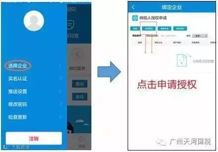 6. 个人实名认证成功后请点击 “人员图标”,点击“选择企业”,再点击“绑定企业”,进入绑定界面后选择“申请授权”:(如认证信息未及时更新,请重新登录)