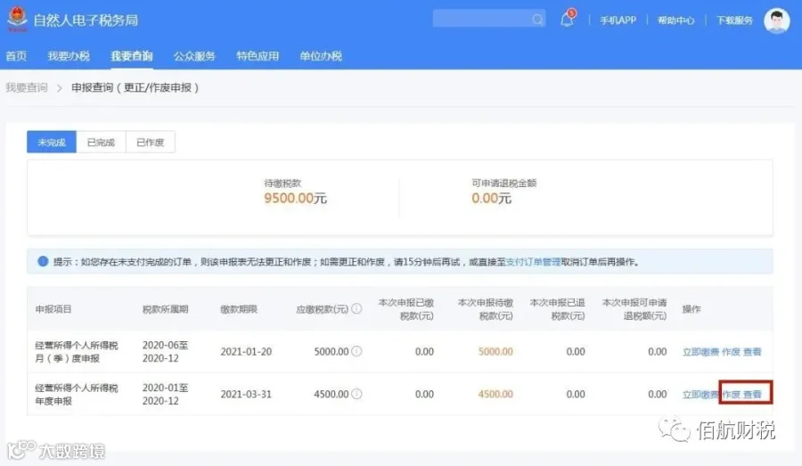 7.申报表报送成功后发现申报有误,可返回修正。点击【我要查询】→【申报查询(更正/作废申报)】→【申报信息查询】→【未完成】或【已完成】,选择对应申报项目点击【查看】,需要更正则点击【修改】。申报成功未缴款时发现有误可作废申报。
