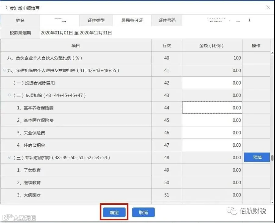 点击申报表填写主界面下方对应投资者的姓名,进入年度汇缴申报填写页面。合伙企业有两个或者两个以上个人合伙人的,确认合伙人分配比例后,分别填报申报表。