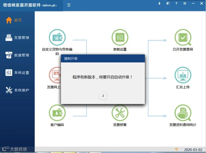登录开票软件时,系统自动检查目前在用的开票软件版本信息,低于V2.3.10.200228版本时,会自动对开票软件进行升级。