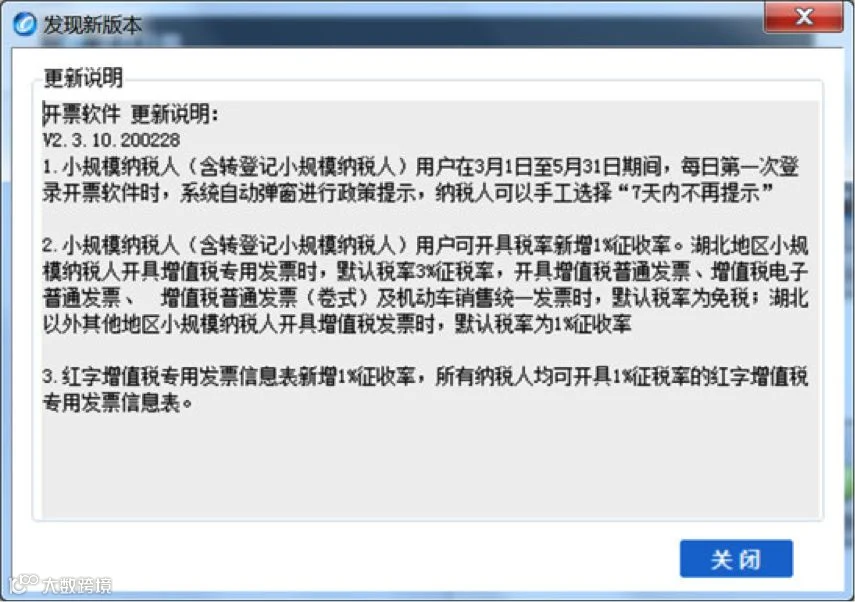 系统会自动对开票软件进行升级,弹出正在升级提示框。此时点击“关闭”按钮可以继续进行开票等其他操作,系统会在后台继续更新。