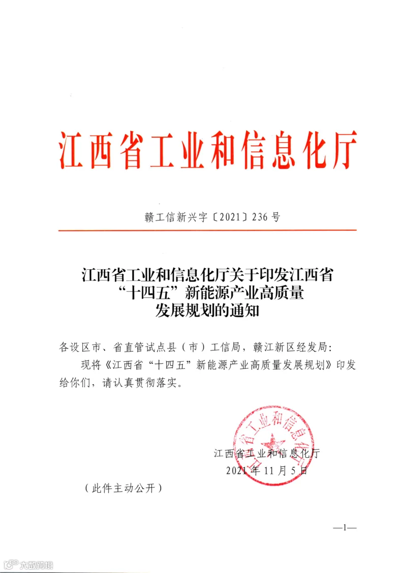 11月初,江西工业和信息化厅印发《江西省”十四五”新能源产业高质量发展规划》。