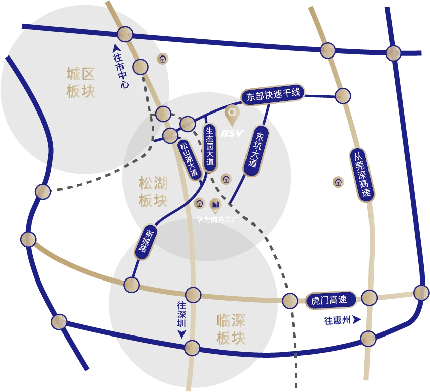 在交通出行上,项目临近松山湖大道、生态园大道、东部快速干线、东坑大道、新城路等城市主干道成为高效物流通路,地铁3号线(在建)、东莞市火车站(常平站)、东莞市汽车东站、松山湖轻轨站北站构成了便捷的通勤轨道交通网络。 “快车道+轻轨+主干道+高速”组合形成的“三高速五干线”立体化交通网络,充分满足商务人士快速出行的要求。