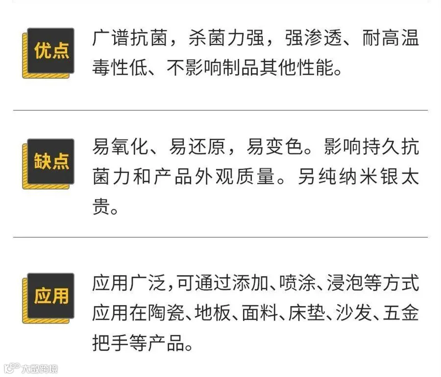 它在家居产品中最为常见,分为金属离子型(银离子),与氧化物型(光触媒),银离子抗菌应用广泛、历史悠久,古代人就使用银器盛食物保鲜,抗起菌来手段丰富、效果突出,而现代常使用纳米银离子来抗菌。