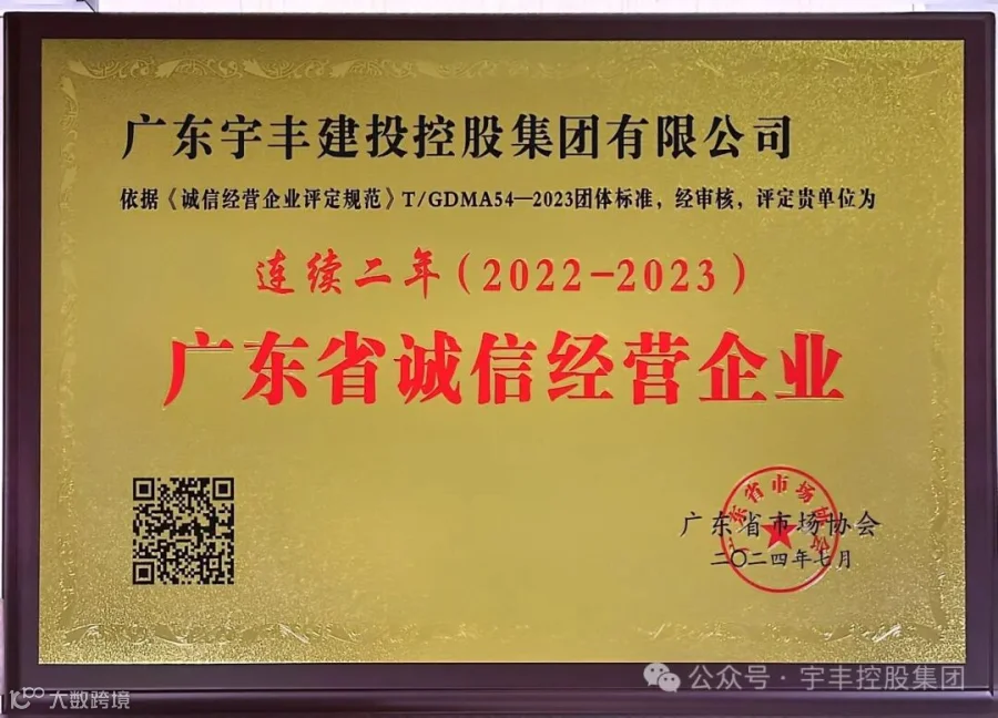 导读:热烈祝贺广东宇丰建投控股集团有限公司荣获连续二年(2022-2023)“广东省诚信经营企业”。