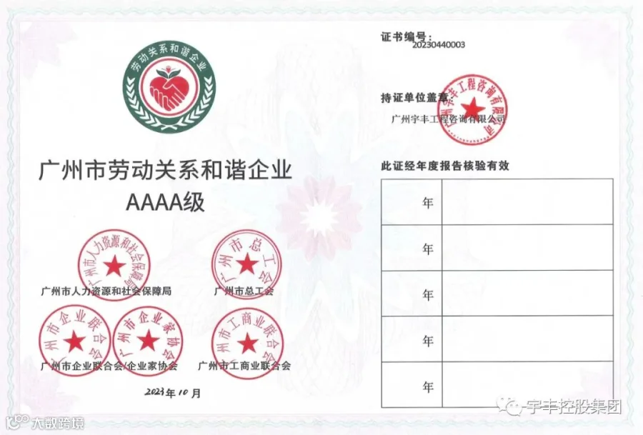 导读:热烈祝贺广州宇丰工程咨询有限公司荣获“劳动关系和谐AAAA级”