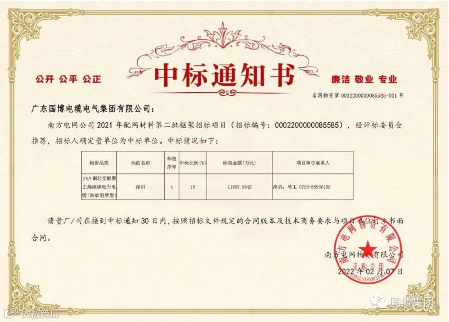 广东国博电缆电气集团有限公司在南方电网公司2021年配网材料框架招标项目中标!