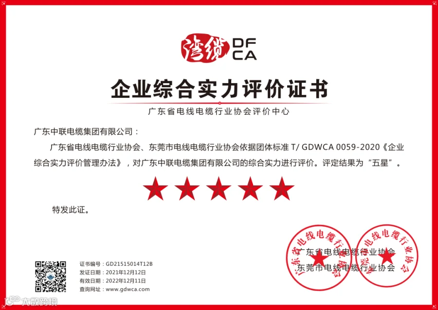 此次广东中联电缆集团有限公司荣获广东省电线电缆行业 “企业综合实力评价”、“企业信用评级”5星好评是对我司实力的肯定,标志着我司在品质及信誉度都获得了市场和行业的高度认可,是社会各界对中联40多年来在品质和服务方面始终坚持严格把控、是实实在在把企业自身成长与城市建设、行业发展融合在一起的实力见证。