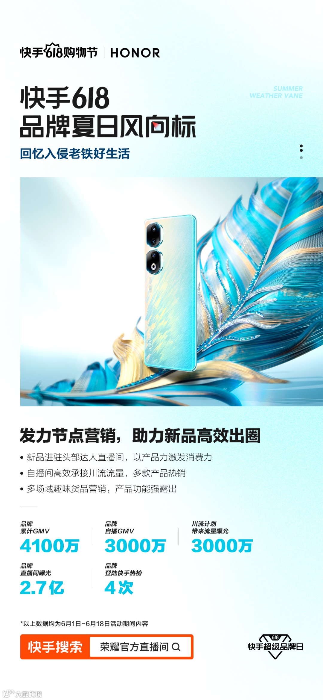 对手机品牌来说,618大促是新机上市、抢占心智的关键时机。今年618前后,荣耀90系列、iQOO Neo8、OPPO的Reno10、vivo X90s就开启了“内卷”上新模式,在各家大秀肌肉、大卷价格的背景下,荣耀新机销量拿下快手站内的第一名。