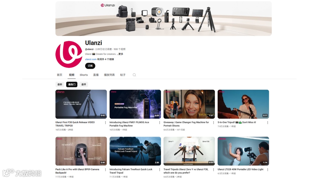 在YouTube上,Ulanzi的官方账号拥有超过2.89万订阅,内容主要包括产品展示、品牌宣传和使用技巧,旨在吸引潜在客户并提升品牌知名度。