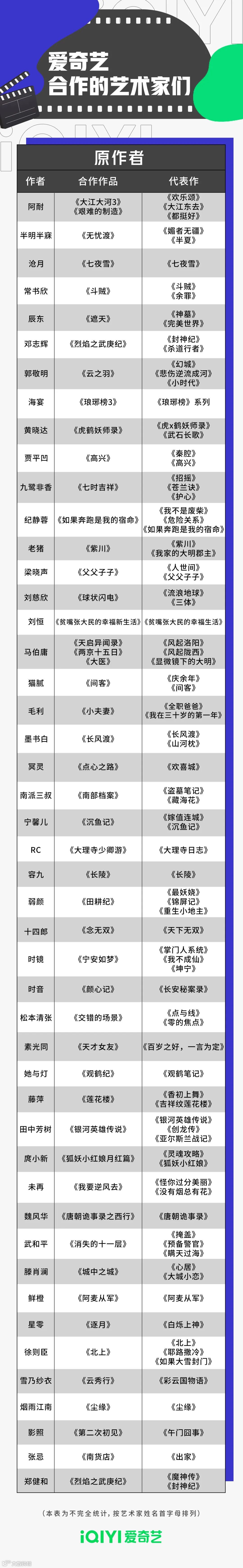 从业经历丰富、从业时间较长的资深导演,如:张永新、曹盾、李路、郑晓龙、沈严、张黎、赵宝刚、孔笙、丁黑、杨阳、姚晓峰、滕华涛、宋晓飞、惠楷栋、温德光、刘海波、李雪、刘新、龚朝晖、林黎胜、柏杉、高寒、王新军、林玉芬、朱锐斌、尹涛、郑伟文、朱少杰……等将继续和爱奇艺开展新项目的合作。